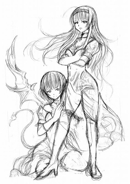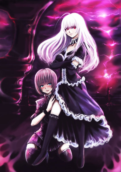以前、イラストを描いていただいた銀髪赤目の妹のイラストを希望します。吸血鬼の真祖みたいなイメージです。足元にその眷属の少女をひざまずかせているシーンを希望します。