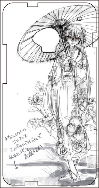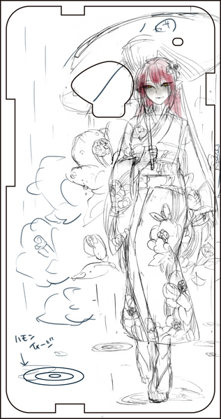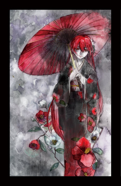 ・雨の中を赤い番傘を差してゆっくりと歩んでいる。